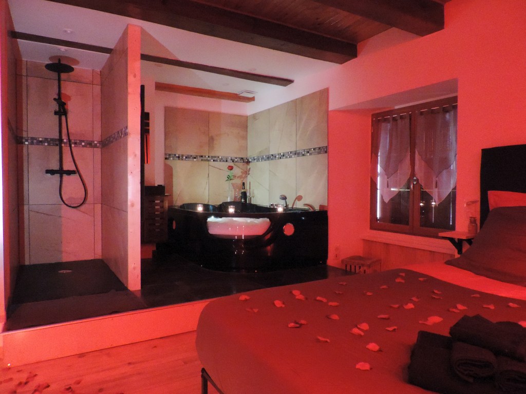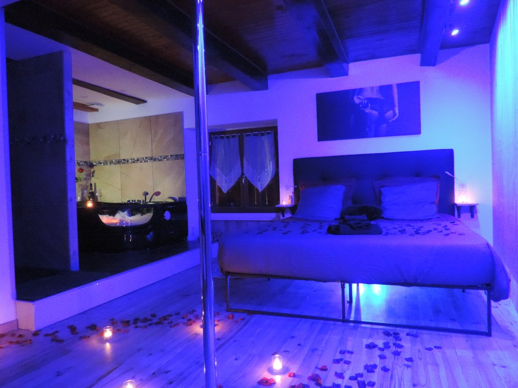 Au premier étage se trouve la chambre avec un lit 180 x 200, une barre de pole dance, une table de massage, une baignoire balnéo 2 personnes ainsi qu’une douche à l’italienne.